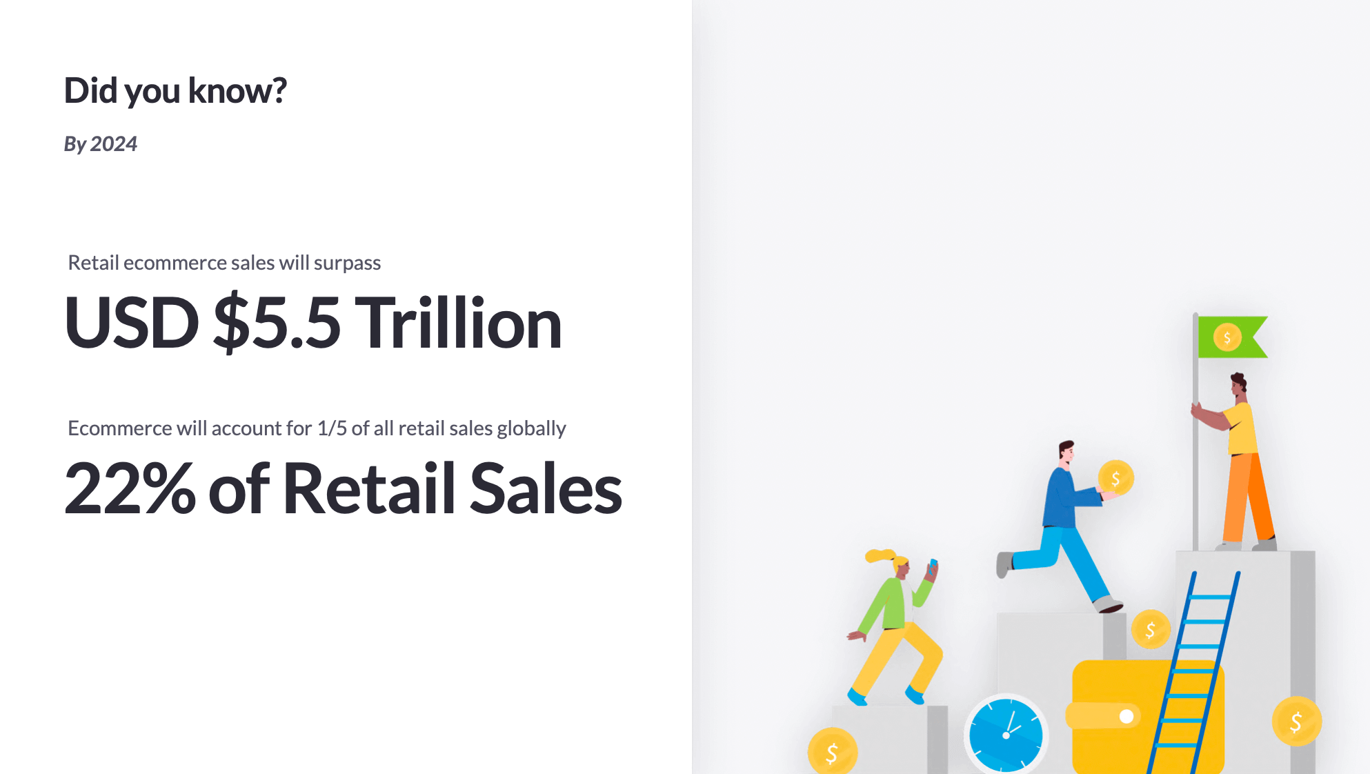 Ecommerce is growing. It’s an industry that we’ve seen growing for the past few years quite rapidly, and by 2024, retail ecommerce sales will surpass $5.5 trillion US dollars and account for 22% of retail sales.